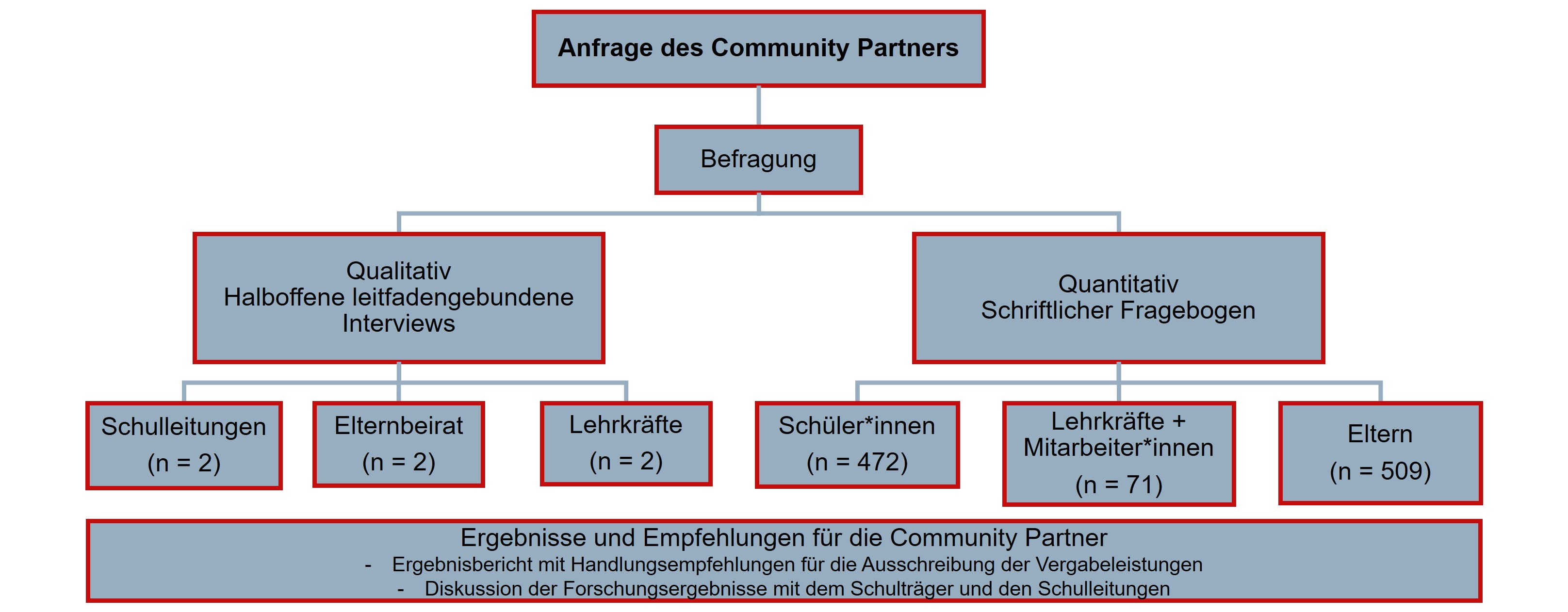 Ausgangspunkt für die Gesamtstudie war das Erkenntnisinteresse des Community Partner (Bildungszentrum), die Akzeptanz der Schulverpflegung bei Schüler*innen, Eltern, Lehrkräften und den weiteren Schulmitarbeiter*innen zu steigern und bei der Neugestaltung der Mensa die Bedürfnisse der schulischen Akteure besser zu berücksichtigen.